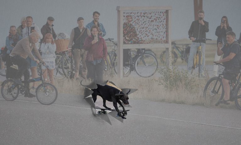 Wo wollte der Hund so schnell auf dem Skateboard hin? Es gibt nur eine Motivation, die solch ungewöhnliche Eile auslöst: Der Druck, etwas loszuwerden…